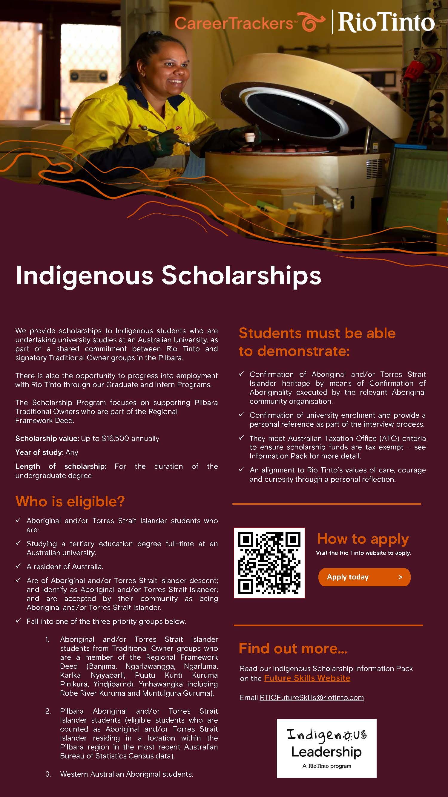 - Priority given to students from Rio Tinto Traditional Owner groups, particularly those within the Regional Framework Deed