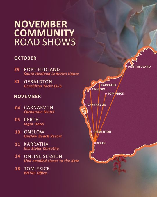 We are pleased to announce that our Community Roadshows will take place in October and November. The roadshows will provide updates on BNTAC activities, including the BNTAC Special General Meeting and Annual General Meetings scheduled for Monday, 24th, and Wednesday, 26th November 2025 in Karratha.